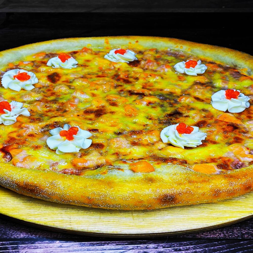 Оригинальная пицца диаметром 32 см в состав которой входит: Фирменное итальянское тесто, соус фирменный, сыры моцарелла, гауда, сыр сливочный, лосось атлантический, икра красная, насыщенный орегано подчеркивает вкус и армат блюда.