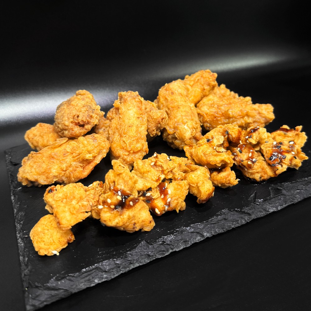 Крылышко курочки, байтсы, ножка курочки в воздушной панировке в сочетании с авторскими специями и приправами, подается с особенным фирменным соусом и сладким чили соусом.