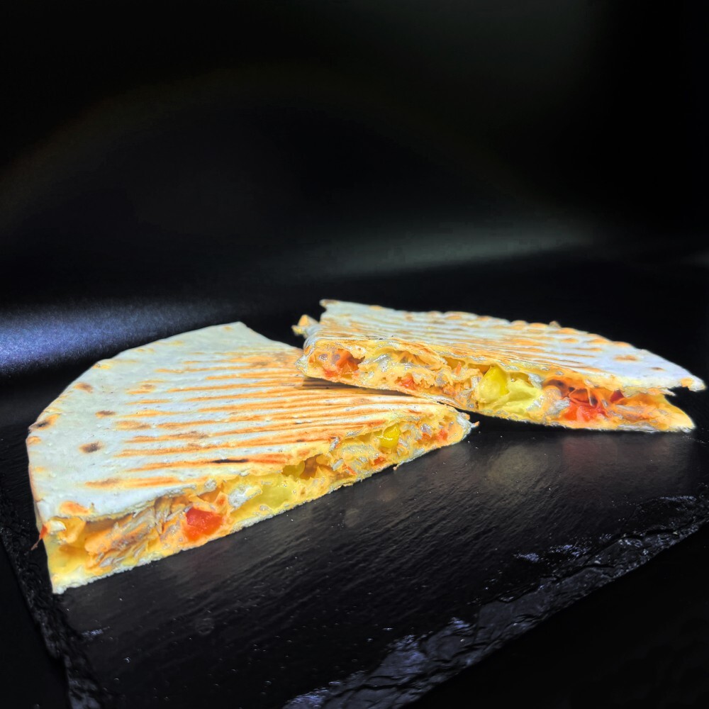 Мексиканская хрустящая лепешка, жареный рваный цыпленок в фирменном соусе, перчик болгарский, лук маринованный, ананас сладкий, кукуруза пикантная, соус фирменный, сыр гауда.