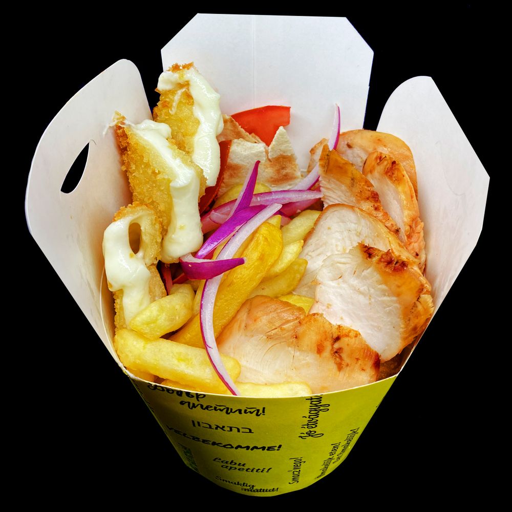 Подача в коробочке, пшеничная пита, сырная котлета (моцарелла, гауда), 100% сочное мясо курочки, картофель фри, жарено-сушеный лук, свежайший овощной микс (томаты, капустка, маринованный лучок), фирменный густой соус с тонкими нотками греческих приправ и специй.