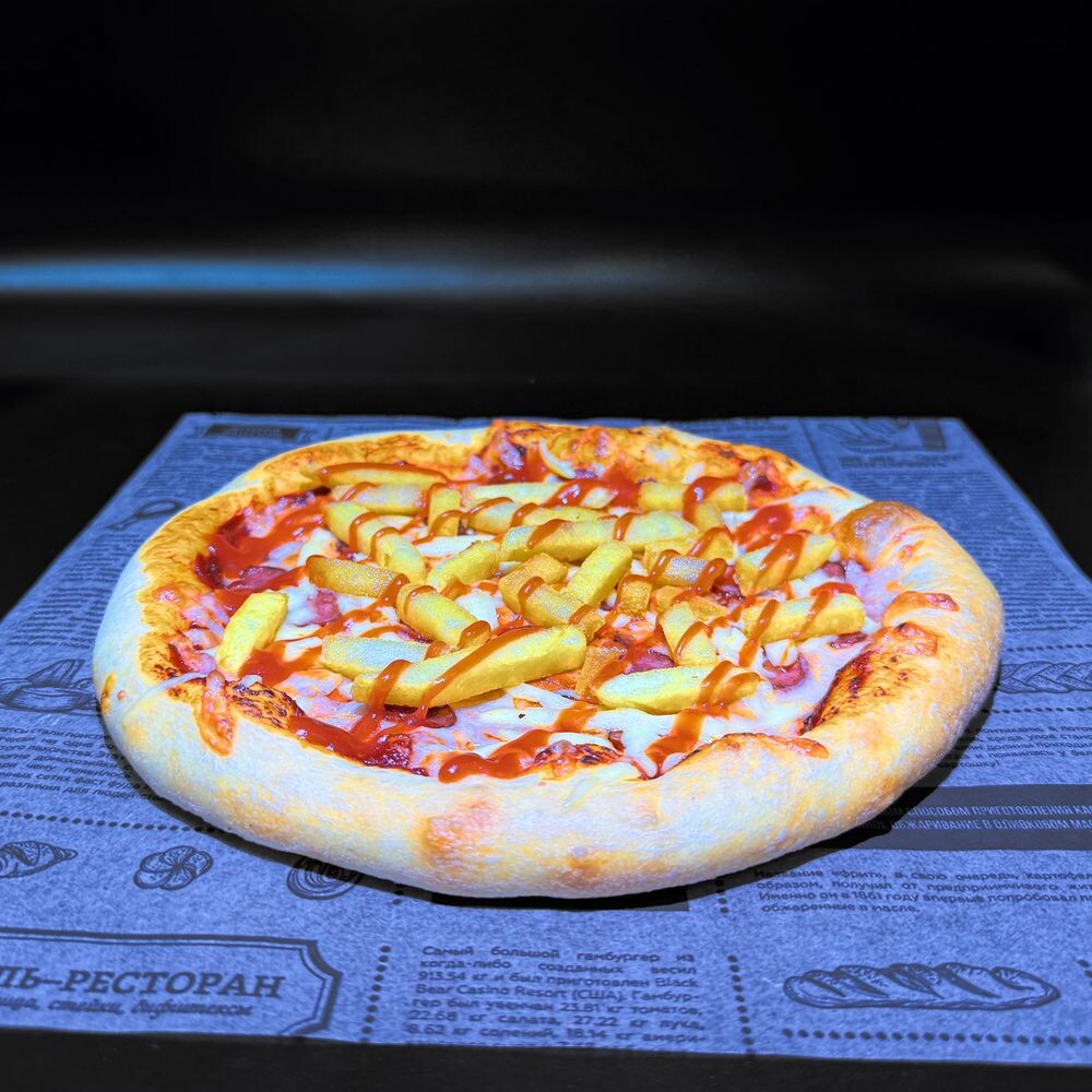 Оригинальная пицца диаметром на выбор в состав которой входит: Фирменное итальянское тесто, соус мутти, сыры моцарелла и гауда, колбаски, картошечка фри, кетчуп, насыщенный орегано подчеркивает вкус и армат блюда.