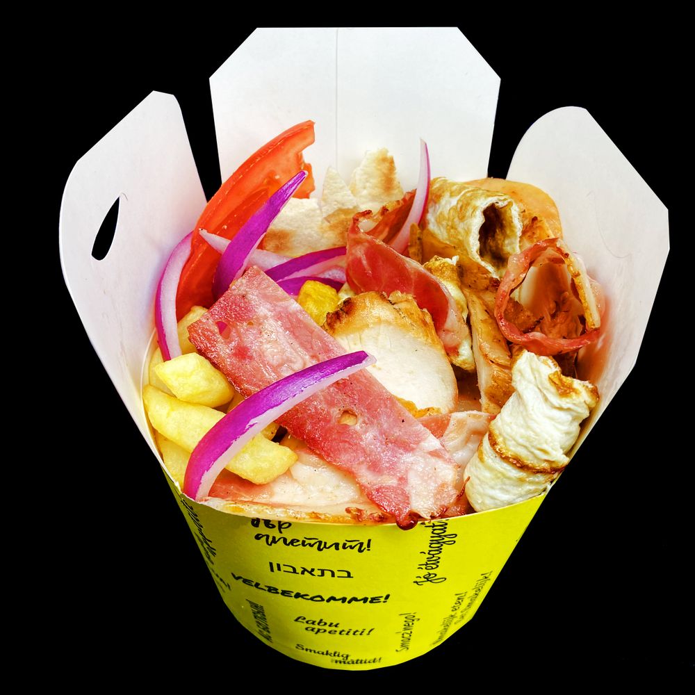 Подача в коробочке, пшеничная пита, сочный бекон, сытный омлет, 100% сочное мясо цыпленка, картофель фри, жарено-сушеный лук, свежайший овощной микс (томаты, капустка, маринованный лучок), фирменный густой соус с тонкими нотками греческих приправ и специй.