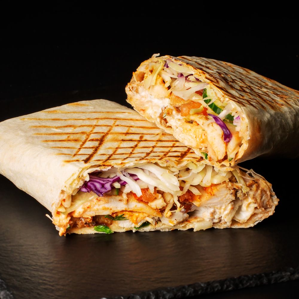 Хрустящий лаваш с сыром, 100% сочное мясо курочки в фирменном красном соусе, картошечка фри, соус барбекю, свежий овощной микс (томаты, капустка, маринованный лучок), фирменный густой белый соус с тонкими нотками греческих приправ и специй.