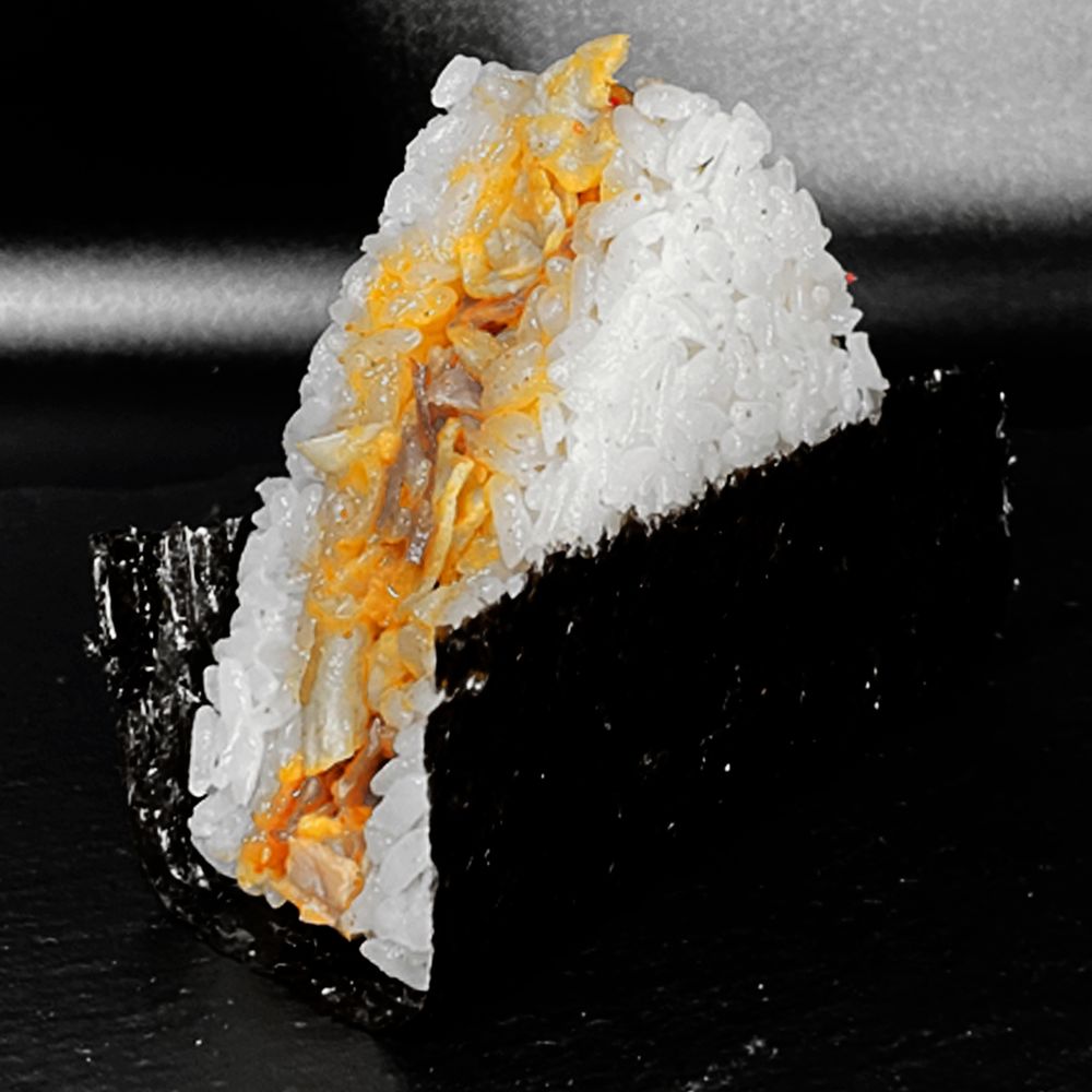Популярное японское блюдо в составе которого: оригинальные нори, 100% премиальный рис с добавлением натуральных соусов и приправ, жареный бекон, японский томаго (омлет), соус фирменный, оригинальные японские пряности.