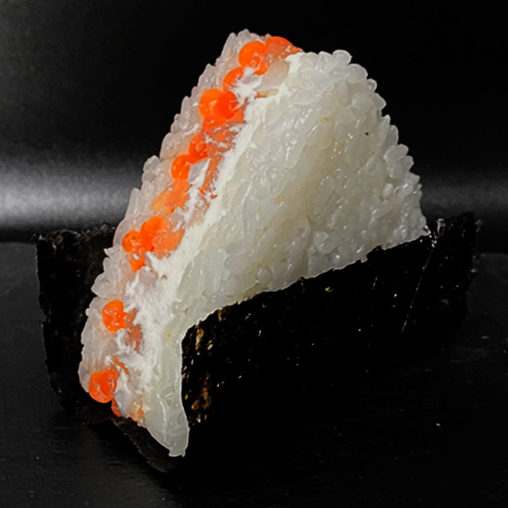 Популярное японское блюдо в составе которого: оригинальные нори, 100% премиальный рис с добавлением натуральных соусов и приправ, филе тихоокеанского лосося, филе тигровой креветки, икра красная, сыр сливочный японский, оригинальные японские пряности.