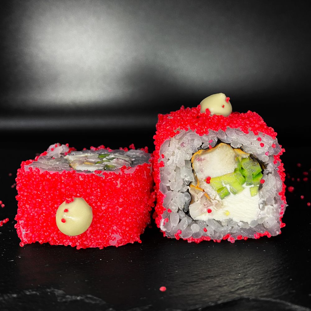 8 штучек фирменных квадратных роллов в составе которых: оригинальные нори, 100% премиальный рис с добавлением натуральных соусов и приправ, натуральный сливочно-твороженный сыр, густой соус, японский огурчик, филе сочного цыпленка, тобико (икра летучих рыб), микрозелень, подается с маринованным имбирем, натуральным васаби, соевым соусом.