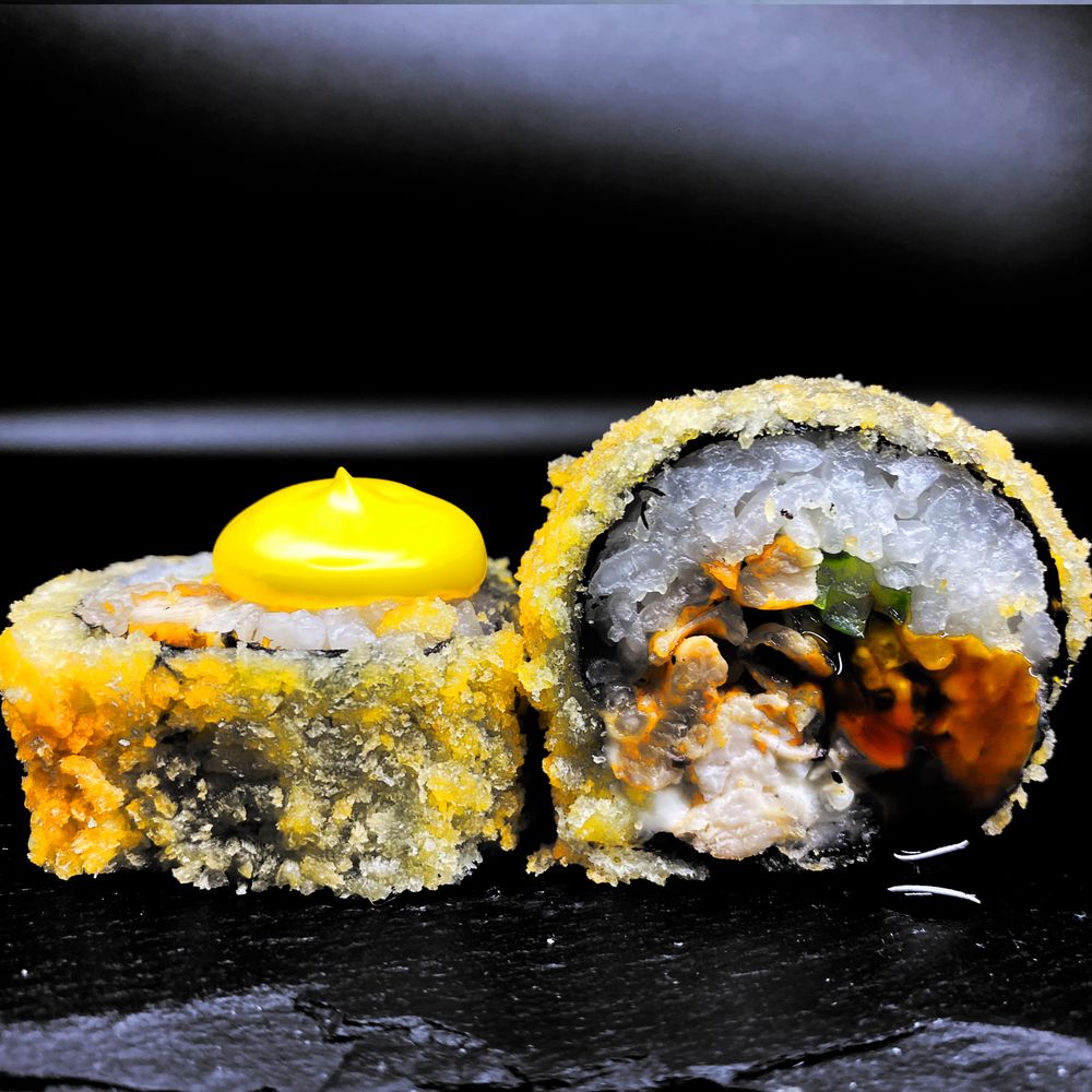 8 штучек фирменных круглых горячих роллов в хрустящей панировке, составе которых: оригинальные нори, 100% премиальный рис с добавлением натуральных соусов и приправ, натуральный сливочно-твороженный сыр, густой соус, японский огурчик, филе сочного цыпленка, унаги соус, сырный соус, микрозелень, панировка, подается с маринованным имбирем, натуральным васаби, соевым соусом.