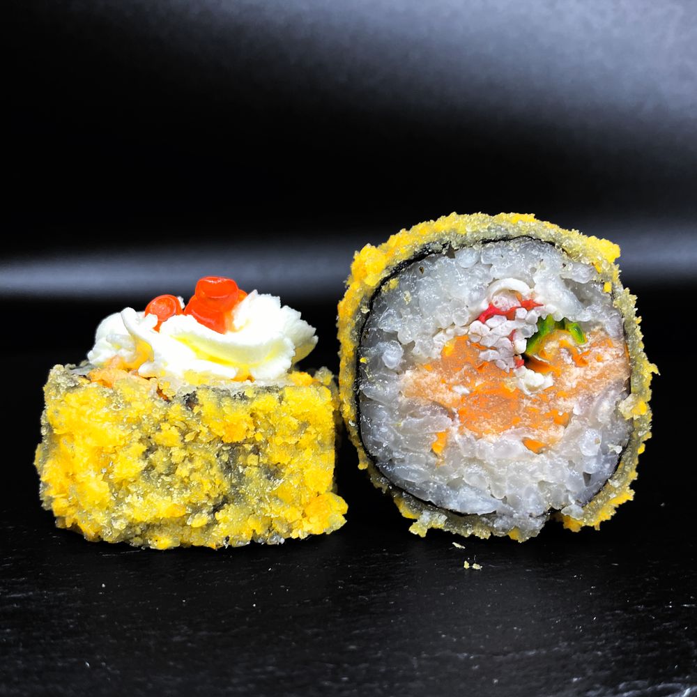 8 штучек фирменных круглых горячих роллов в хрустящей панировке, составе которых: оригинальные нори, 100% премиальный рис с добавлением натуральных соусов и приправ, натуральный сливочно-твороженный сыр, густой соус, японский огурчик, филе снежного краба, филе тихоокеанского лосося, икра красная, микрозелень, панировка, подается с маринованным имбирем, натуральным васаби, соевым соусом.